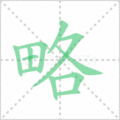 字典 略的笔顺、笔画、写法、部首略笔顺、写法:略,拼音:lüè,笔画数:11画,部首:田。中国一级汉字,编号2277。■ 基本字义• 略l<è ㄌㄩㄝˋ• 大致,简单,不详细:大略。简略。粗略。略微。略有所闻。略知一二。• 省去,简化:省略。忽略。其余从略。• 简要的叙述:史略。要略。事略。• 计谋:方略。策略。战略。• 抢,掠夺:侵略。攻城略地。略的组词 略的拼音